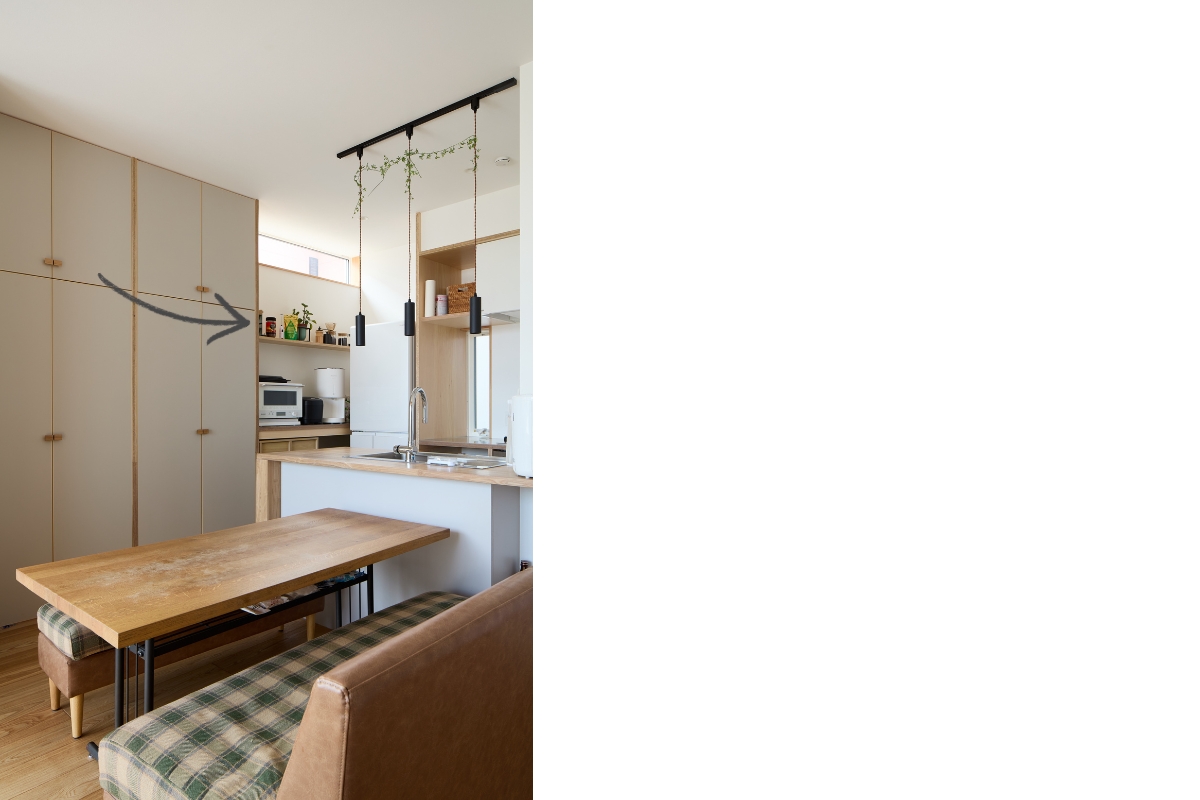 雑多になりやすい物も隠す収納で整頓。