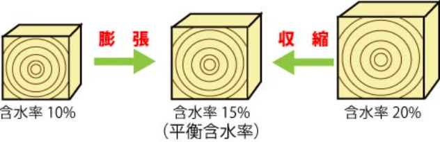 木が水分を含むとどうなるのか、大体のイメージで分かるかと思いますが、膨張し体積が増えます。